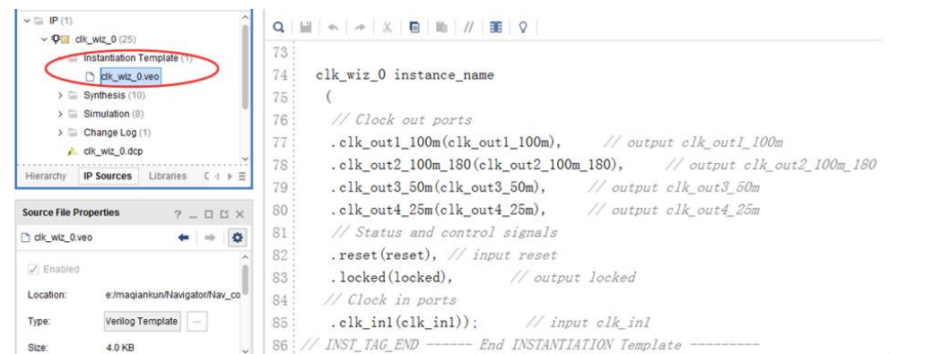 首先打开IP核的例化模板,在“Source”窗口中的“IP Sources”选项卡中,依次用鼠标单击展开“IP”-“clk_wiz_0”-“Instantitation Template”,我们可以看到“clk_wiz.veo”文件,它是由 IP 核自动生成的只读的 verilog 例化模板文件,双击就可以打开它,在例化时钟 IP 核模块的时钟,可以直接从这里拷贝,如下图所示