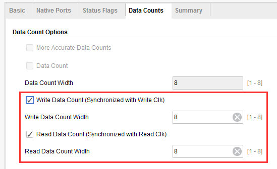 “Data Counts”选项卡用于设置 FIFO 内数据计数的输出信号,此信号表示当前在 FIFO 内存在多少个有效数据。为了更加方便地观察读/写过程,这里我们把读/写端口的数据计数都打开,且计数值总线的位宽设置为满位宽,即 8 位。这里还要注意“Write Data Counts”和“Read Data Counts”分别同步到写侧时钟和读侧时钟,他们的值是不同时钟域下的值。如下图所示: