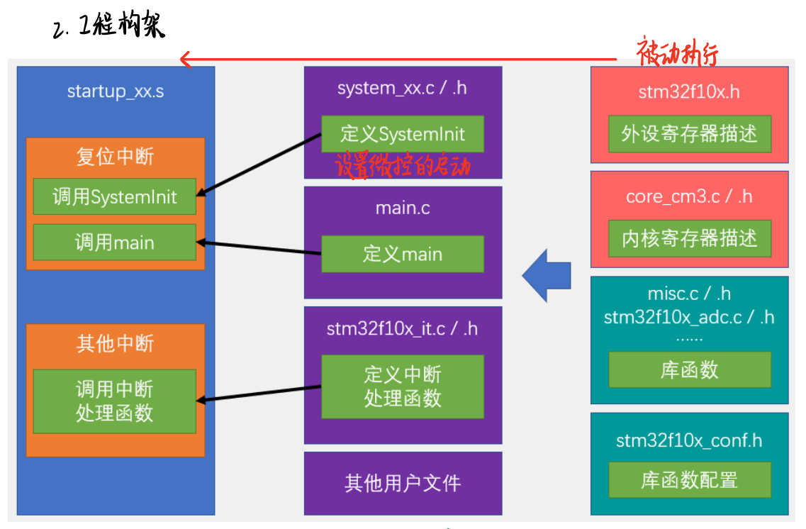 所以在使用这些库函数时,我们只需要包含stm32f10x.h这一个头文件,就相当于包含了所有的库函数头文件,这样我们就可以任意地调用库函数了。
